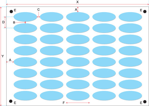 Centre spacing on width of labels (D) to be in multiples of 5mm ie 20mm, 25mm, 30mm etc.